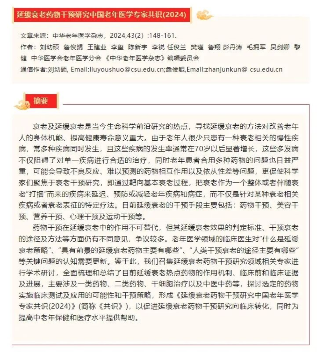 24年2月,由中華醫(yī)學(xué)會老年醫(yī)學(xué)分會發(fā)起,我國老年醫(yī)學(xué)專家中從事延緩衰老藥物干預(yù)研究相關(guān)專家、學(xué)者共同完成的首部《延緩衰老藥物干預(yù)研究中國老年醫(yī)學(xué)臨床專家共識2024》(以下簡稱“共識”)頒布。