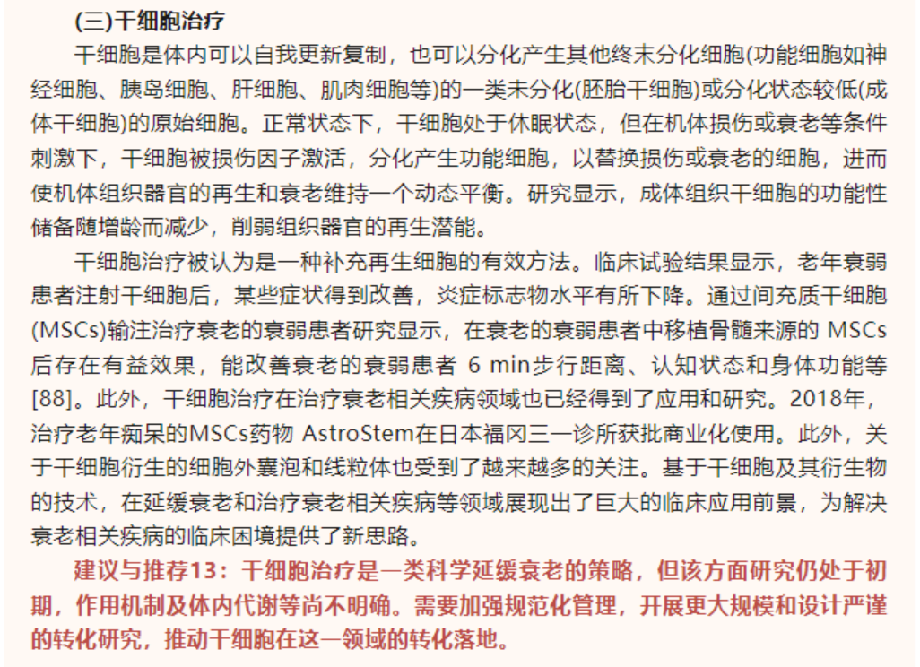 干細(xì)胞具有自我更新、多向分化和免疫調(diào)節(jié)等能力,目前多項臨床研究已證實了干細(xì)胞在這對退行性疾病中的潛在作用。根據(jù)我國《老年醫(yī)學(xué)與保健》雜志上發(fā)布的《中國衰老與抗衰老專家共識(2019年)》[8],成體干細(xì)胞的衰老乃至耗竭是組織器官衰老和老年性疾病的重要誘因。