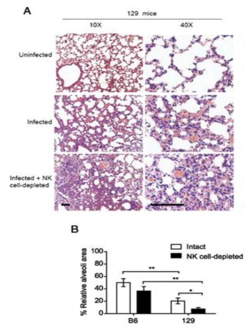 一篇發表在國際免疫醫學期刊《the Journal of immunology》中題為《Swift and Strong NK Cell Responses Protect 129 Mice against High-Dose Influenza Virus Infection 》的研究中,研究人員發現,在兩組小鼠同時面對大劑量流感病毒時,體內NK細胞數量低的小鼠的感染率更高,因為病毒感染而受到的肺部損傷也更嚴重。(如下圖)