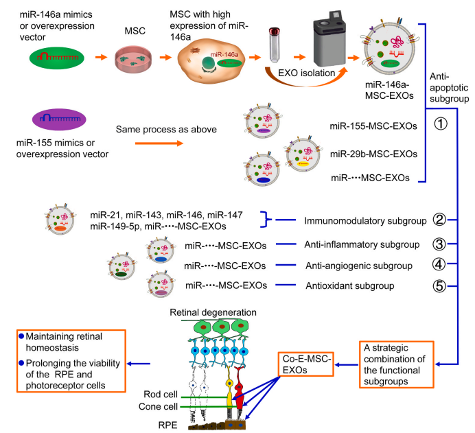 因此,研究者可以利用基因工程技術手段將具有抗凋亡功效的miRNAs在MSCs中過表達,工程MSCs釋放的EXOs將攜帶上調(diào)的miRNAs,進而收獲具有抗凋亡功效的工程化EXOs,用于RP的治療[8]。如有必要,可以在MSCs中過表達不同功效的miRNAs,如抗炎、抗氧化、抗血管生成、免疫調(diào)節(jié)等,最終得到改造后的EXOs,用于眼部疾病的治療(圖三)。