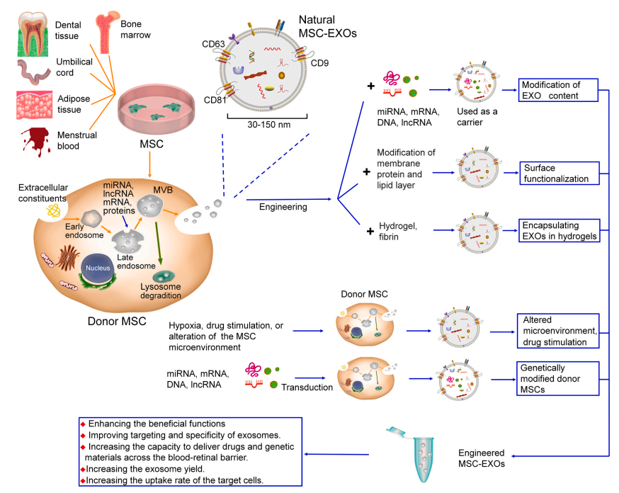 圖一:MSC-EXOs的生物發(fā)生、釋放和工程策略的示意圖