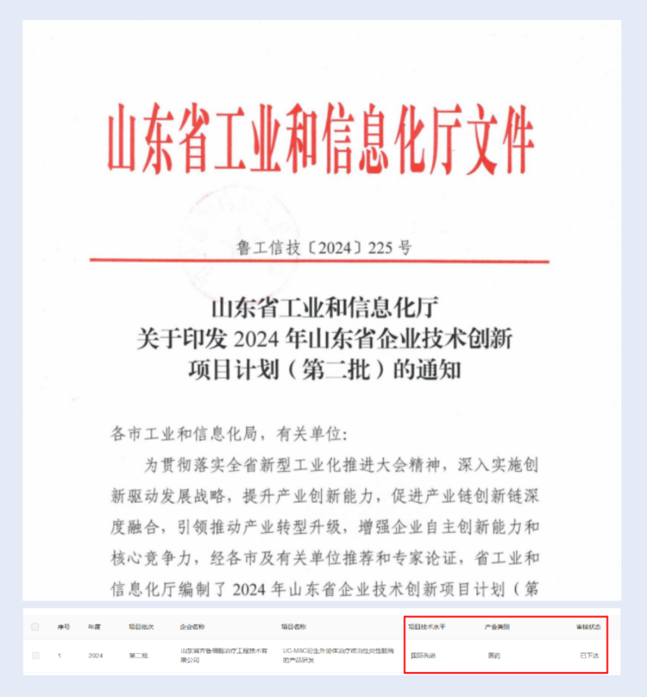 ?近日,山東省工業和信息化廳發布了《關于印發2024年山東省企業技術創新項目計劃(第二批)的通知》。經地市推薦、專家組審核,山東省齊魯細胞治療工程技術有限公司(以下簡稱“齊魯細胞”)申報的“UC-MSC衍生外泌體治療難治性炎性腸病的產品研發”項目成功入選。