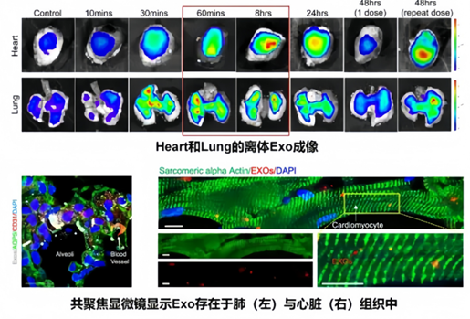 研究人員檢測了吸入的外泌體在小鼠體內(nèi)的分布情況。檢測顯示,吸入的外泌體在10至60分鐘內(nèi)迅速聚集在肺部與心臟。在60分鐘時,外泌體開始在心臟中累積,這種累積與肺部信號的減少同時發(fā)生,這表明外泌體持續(xù)穿過肺泡毛細血管屏障,被損傷的心肌募集。重復給藥能夠使得48小時后在心臟中仍然保留大量的外泌體。