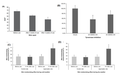 研究人員利用含有間充質(zhì)干細(xì)胞外泌體的條件培養(yǎng)基制成乳霜,并進(jìn)行相關(guān)測(cè)試。結(jié)果表明,使用3DADMSC-CM分別抑制了約24%和33%的TYR和黑色素的抑制作用,并增加了透明質(zhì)酸合酶的表達(dá)。使用3DADMSC-CM4周后觀察到皮膚抗氧化評(píng)估的顯著差異。使用2周和4周后,膚色和光澤增加,皮膚雀斑明顯減少。在極寒和干燥的天氣條件下,使用面霜增加了皮膚的保濕度。