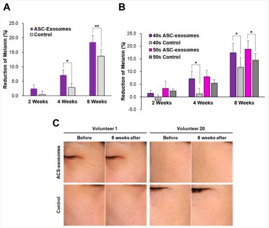 圖2.ASC-外泌體美白效果的臨床評(píng)價(jià)。(A)隨著時(shí)間的推移,黑色素減少。(B)不同年齡組的黑色素減少。(C)兩名受試者的代表性圖像