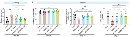 在AD患者的大腦里,堆積著兩種“垃圾”:β-淀粉樣蛋白(Aβ)和tau蛋白。外泌體可以作為“清潔工”清除這兩種“垃圾”的聚集。骨髓間充質干細胞來源的外泌體可以通過激活SphK/SIP信號通路,減少腦內Aβ的沉積,促進AD小鼠認知功能的恢復;神經干細胞來源的外泌體可以大幅降低Aβ和磷酸化tau蛋白的水平。上海交通大學醫學院附屬瑞金醫院王剛教授團隊完成并于2023年發布采用間充質干細胞來源的外泌體噴鼻治療阿爾茨海默病的國際首個臨床試驗,證明了人脂肪衍生的間充質干細胞外泌體(ahaMSC-Exos)鼻內給藥可改善AD病理狀態及空間記憶,為進一步臨床試驗提供了劑量選擇和參考依據。