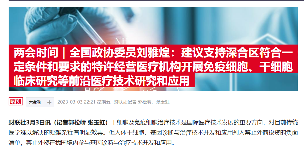 3月3日,劉雅煌在接受財聯社專訪時透露,今年全國兩會他帶來的其中的一份“關于支持琴澳深合區開展前沿醫療技術研究和應用助推大健康產業的提案”。劉雅煌建議:支持深合區符合一定條件和要求的特許經營醫療機構開展免疫細胞、干細胞臨床研究等前沿醫療技術研究和應用。