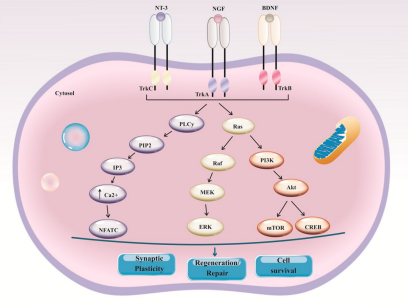 目前,干細胞技術被認為是治療PD、HD、AD和ALS的一種令人興奮和可行的技術。間充質干細胞(mesenchymal stromal cells, MSCs)可以有效地從成人組織中分離出來,在培養物中體外培養,并以自體或異體安全的方式進行移植,因此在細胞治療方面具有巨大的潛力[2]。MSCs被發現能夠向神經細胞分化,并分泌多種分子,反過來幫助修復神經組織(圖1)。