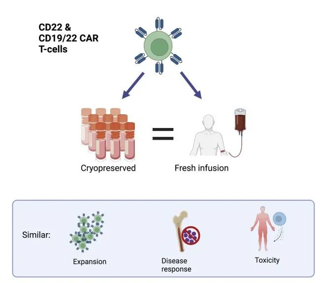 參考文獻:Alexandra Dreyzin, Sandhya R. Panch, Haneen Shalabi. Cryopreserved anti-CD22 and bispecifific anti-CD19/22 CAR T cells are as effective as freshly infused cells. doi: 10.1016/j.omtm.2022.12.004.