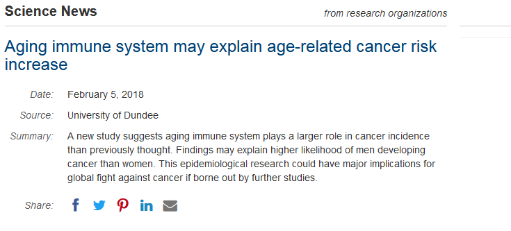 鄧迪大學的Thea Newman教授課題組和赫瑞?瓦特大學、愛丁堡大學、法國Curie學院的科學家們也發現了癌癥發病率與衰退的免疫系統有很大的關系。