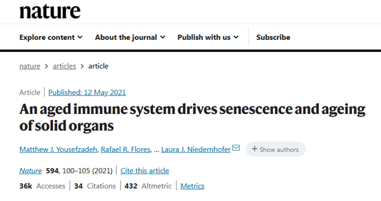 2021年5月12日,美國明尼蘇達大學醫學院的研究人員在國際頂尖學術期刊 Nature 發表了題為:An aged immune system drives senescence and ageing of solid organs 的研究論文。