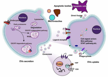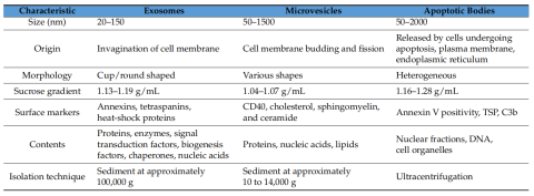到目前為止,細胞基本上釋放出三種EV亞型:外泌體、微囊泡(MVs)和凋亡小體,直徑分別為20-150nm、50-1000nm和大于1000 nm[4]。下表總結(jié)了EVs的特點。