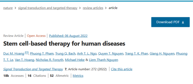 [1] Hoang DM, Pham PT, Bach TQ, et al. Stem cell-based therapy for human diseases. Signal Transduct Target Ther. 2022;7(1):272. Published 2022 Aug 6. doi:10.1038/s41392-022-01134-4