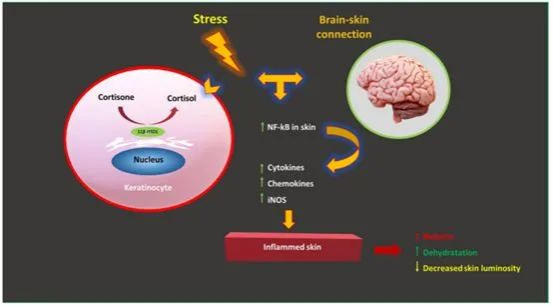當人體處于緊張狀態的時候,腎上腺應對壓力分泌皮質醇,當皮質醇水平增加時,皮脂腺會分泌更多的油脂,同時也會讓皮膚變得敏感。這樣,皮膚開始出油,并很容易泛紅脆弱。另外研究發現,伴隨皮質醇系統啟動,炎癥因子也會開始發生作用;在壓力應激模式下,皮膚中會產生各種各樣的炎癥因子。這些炎癥因子除了讓皮膚出現異狀,還會放大痘痘等問題。
