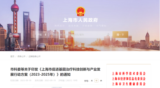 2.上海市促進基因治療科技創新與產業發展行動方案(2023-2025年);