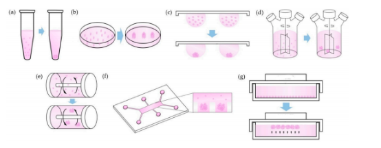 △圖2 細胞球形成方案[4](a)離心法;(b)低吸附涂層;(c)懸滴法;(d)生物反應器培養;(e)轉瓶培養(f)微流控法;(g)芯片法。