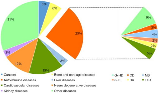 間充質干細胞(MSCs)是具有自我更新、多向分化、旁分泌和免疫調節作用的多能細胞。由于這些特性,MSCs具有很大的臨床應用前景,特別是在損傷組織的再生、功能重建和細胞臨床應用方面。Pardis 2019年在Stem Cell Investigation上詳細描述了MSC臨床實驗涉及的疾病類型。MSC臨床應用研究的主要適應癥是自身免疫疾病、心血管疾病和神經退行性疾病(圖1)。