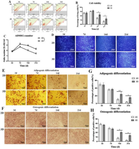 2020年Yin Q等比較了三維和二維培養后的脂肪間充質干細胞的變化。發現ADMSCs(脂肪來源的間充質干細胞)在3D環境中的細胞形態、增殖、分化能力和能量代謝情況得到改善。3D培養間充質干細胞可以提高細胞產量,促進分化,維持干性,為MSC在工業大規模擴增提供有前景的策略,具有一定的潛力(圖4,圖5)[6]。