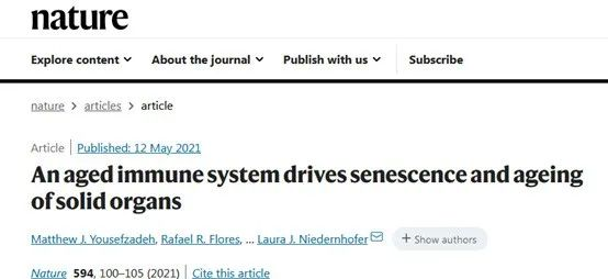 2021年5月12日,美國明尼蘇達大學醫學院的研究人員在國際頂尖學術期刊 Nature 發表了題為:An aged immune system drives senescence and ageing of solid organs 的研究論文。