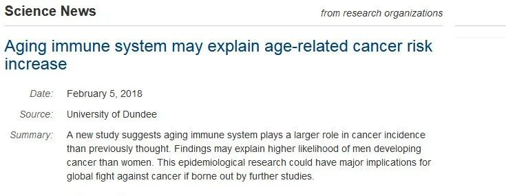 除此以外,鄧迪大學的Thea Newman教授課題組和赫瑞?瓦特大學、愛丁堡大學、法國Curie學院的科學家們也發現了癌癥發病率與衰退的免疫系統有很大的關系。