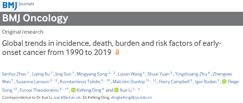 在2023年9月5日,浙江大學(xué)醫(yī)學(xué)院公共衛(wèi)生學(xué)院大數(shù)據(jù)健康科學(xué)系李雪研究員、浙江大學(xué)醫(yī)學(xué)院附屬第二醫(yī)院丁克峰教授等在 BMJ Oncology 期刊上發(fā)表了一篇題為:Global trends in incidence,death,burden and risk factors of early-onset cancer from 1990 to 2019 的研究論文。