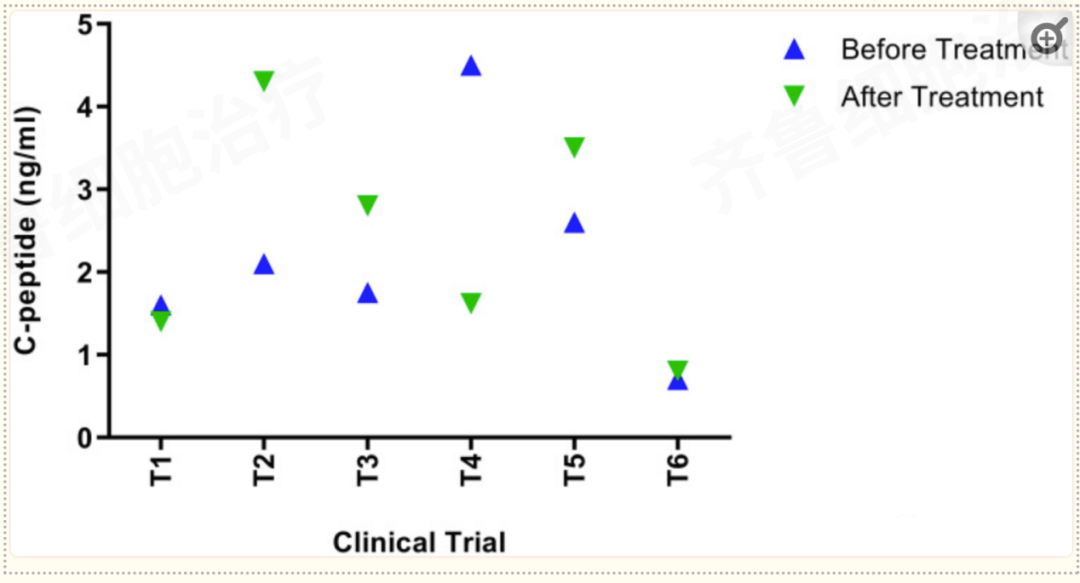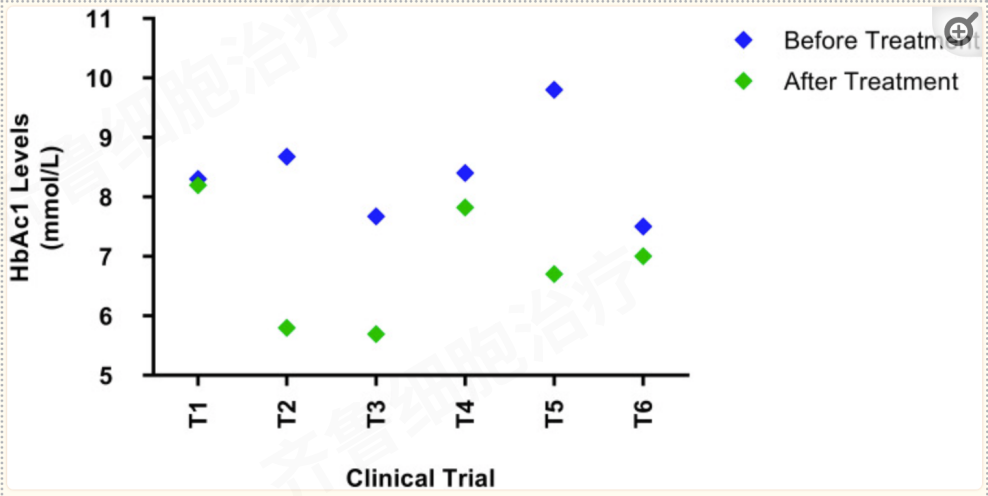 用間充質(zhì)干細(xì)胞的實(shí)驗(yàn)組可減少注射后長(zhǎng)達(dá)12個(gè)月的胰島素依賴性。在所有試驗(yàn)中,F(xiàn)BG(空腹血糖)均降至3.9至5.5 g/mmol 的正常范圍。胰島素抵抗(HOMA-IR)、β細(xì)胞功能HOMA-β和胰島素敏感性HOMA-S的穩(wěn)態(tài)模型評(píng)估(HOMA)測(cè)量了研究前后參與者的胰島素水平;六項(xiàng)研究中的一項(xiàng)沒(méi)有發(fā)現(xiàn)胰島素抵抗顯著降低。
