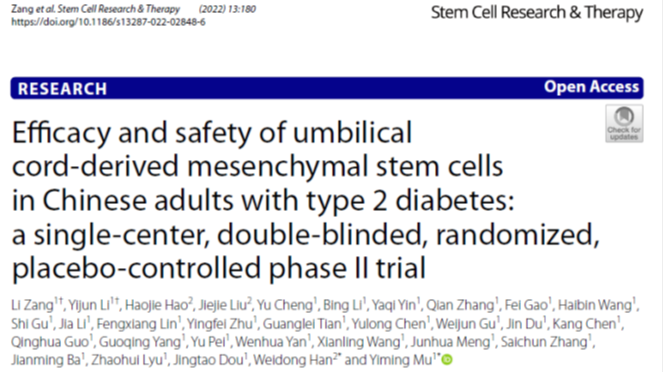 2022年5月,中國(guó)人民解放軍第一醫(yī)學(xué)中心(原301醫(yī)院)母義明教授團(tuán)隊(duì)在Stem Cell Research & Therapy雜志發(fā)表了《臍帶間充質(zhì)干細(xì)胞治療中國(guó)成人2型糖尿病的療效和安全性的II期臨床試驗(yàn)》[6]。研究表明:間充質(zhì)干細(xì)胞治療可能是成人2型糖尿病(T2DM)潛在的治療方法。