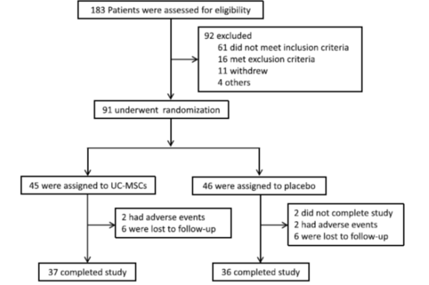 參加這項(xiàng)單中心、雙盲、隨機(jī)對(duì)照II期臨床試驗(yàn)的共有91例2型糖尿病患者,隨機(jī)分為間充質(zhì)干細(xì)胞治療(UC-MSCs)組(45例)和安慰劑組(46例)。UC-MSCs組給予靜脈輸注1×106 /kg,共輸注3次,每次間隔4周。對(duì)照組給予安慰劑輸注,隨訪48周。