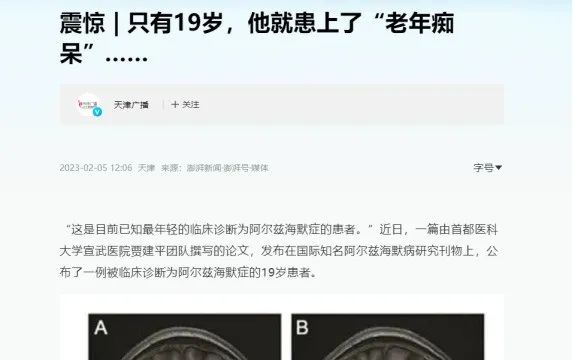 國(guó)際知名學(xué)術(shù)刊物《阿爾茲海默癥期刊》上曾刊登過(guò)一篇論文,公布了一例被臨床診斷為阿爾茲海默癥的19歲患者。刷新大眾對(duì)于該病認(rèn)知的同時(shí),也讓“癡呆癥”、“認(rèn)知障礙”等再一次被大眾所熱議和關(guān)注。