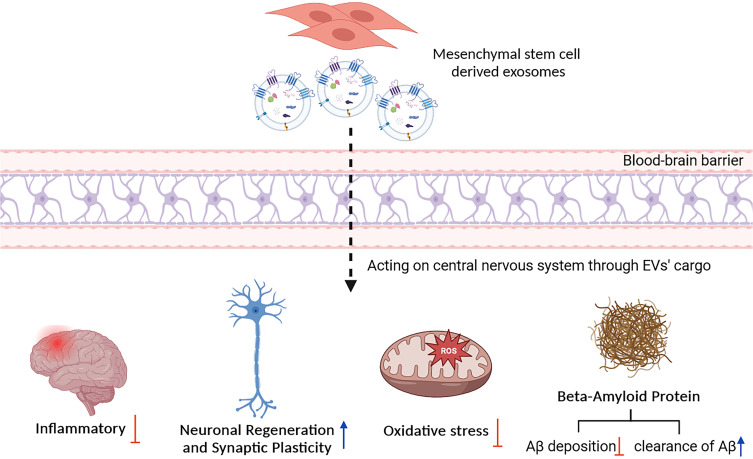 很多研究表明,MSC-Exos中相對(duì)恒定的含量,如miRNAs和細(xì)胞因子能夠通過(guò)促進(jìn)神經(jīng)元再生和突觸可塑性、抗炎、抗氧化和減少β-淀粉樣蛋白等方面來(lái)改善認(rèn)知障礙。