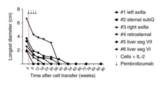 在國際頂級期刊《Nature》上的另一篇文章——《Immune recognition of somatic mutations leading to complete durable regression in metastatic breast cancer》[5],分享了一個腫瘤患者在接受免疫細胞應用后被治愈的例子。
