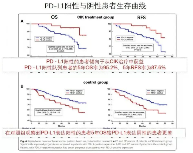 研究結果顯示,乳腺癌組織中表達高水平PD-L1的乳腺癌患者術后患者接受免疫細胞治療的療效更好。在CIK治療組,PD-L1陽性患者預后較好,即PD-L1陽性患者傾向于從CIK治療中獲益更大。PD-L1陽性隊列患者的5年OS率為95.2%,5年RFS率為87.6%。而在對照組中,PD-L1陽性患者預后較差,這與先前的研究結果一致,即PD-L1與不良預后相關。