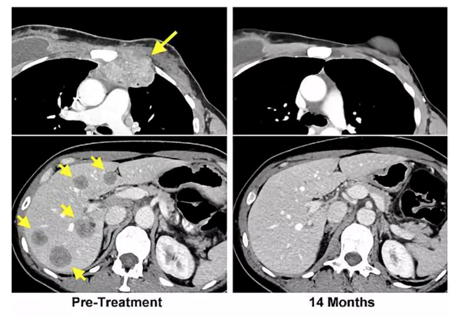 在22個月后,該患者體內各處的腫瘤體積就大幅縮小,在結束治療的14個月后,復查也顯示,該名患者原發部位的腫瘤消失了。