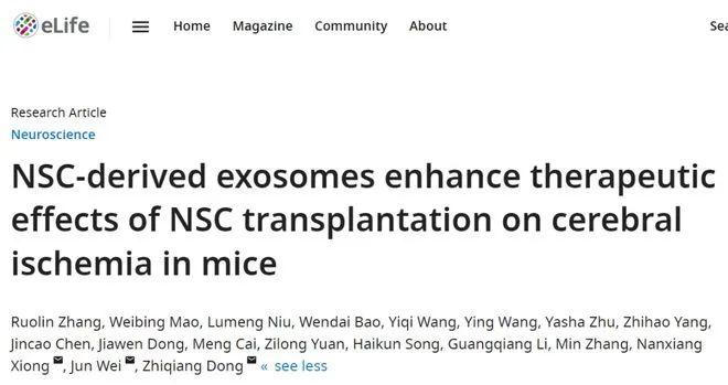 2023年4月27日,國(guó)內(nèi)一科研團(tuán)隊(duì)在國(guó)際著名學(xué)術(shù)期刊eLife上發(fā)表了題為:NSC-derived exosomes enhance therapeutic effects of NSC transplantation on cerebral ischemia in mice 的研究論文。
