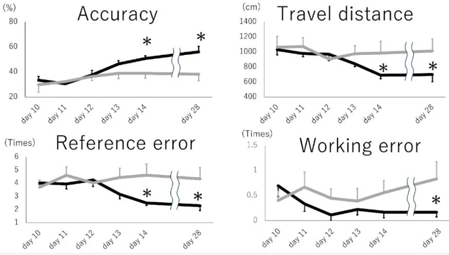 短期和長(zhǎng)期記憶障礙測(cè)試。接受鼻內(nèi)外泌體的動(dòng)物在準(zhǔn)確性(正確臂進(jìn)入/所有臂進(jìn)入)、行程距離、參考錯(cuò)誤(錯(cuò)誤臂進(jìn)入)和工作錯(cuò)誤(進(jìn)入先前收集顆粒的臂)方面表現(xiàn)出更好的記憶功能。黑色:外泌體組,灰色:PBS組,*: p < 0.05。