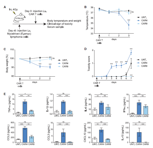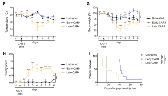 另外,作者還發(fā)現(xiàn)在與未經(jīng)治療的小鼠相比,在高腫瘤負(fù)荷的情況下進(jìn)行CD4+CAR-T細(xì)胞治療更容易引發(fā)CRS,包括體溫下降、體重減輕、疾病評分高和過早死亡(圖7) ,低腫瘤負(fù)荷的CAR4 T細(xì)胞治療沒有引發(fā)可檢測到的毒性。這也暗示CD4+CAR-T細(xì)胞占優(yōu)勢加上高腫瘤負(fù)荷更容易導(dǎo)致CRS的發(fā)生。