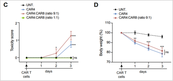 圖 5. 輸注混合CAR-T細(xì)胞CD4/CD8比例為9:1時產(chǎn)生更高的毒性。
