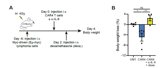 該團(tuán)隊使用免疫健全的小鼠構(gòu)建了Eμ-myc B細(xì)胞淋巴瘤小鼠模型。將小鼠分為純化的CD4+ CAR-T 治療組、純化的CD8+ CAR-T治療組和未治療組。結(jié)果顯示CD4+ CAR-T的輸注產(chǎn)生了明顯的毒性,治療第3天體溫急劇降低,體重下降,血清細(xì)胞因子和趨化因子普遍升高(圖3)。而且地塞米松和anti-IL-6的干預(yù)可以減輕體重的降低(圖4),這是臨床治療CRS的有效措施。而CD8+ CAR T的毒性表現(xiàn)則與對照組差別不大。說明CAR-T輸注后的毒性反應(yīng)主要是由CD4+T細(xì)胞引起的,而不是CD8+T。