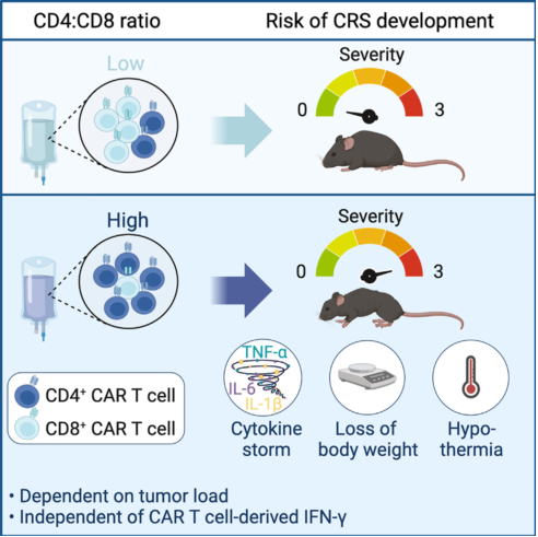 那么是什么導(dǎo)致的CRS呢?研究表明,CD4+ CAR -T和CD8+ CAR -T細(xì)胞的比例是CRS相關(guān)的一項重要指標(biāo),然而,目前尚不十分清楚CD4+ CAR T細(xì)胞和CD8+ CAR T細(xì)胞對于引起CRS產(chǎn)生的作用是否相同。近期,來自巴斯德研究所的Philippe Bousso團(tuán)隊通過研究發(fā)現(xiàn), CRS的發(fā)生是主要由CD4+ CAR-T細(xì)胞介導(dǎo)的,而且在腫瘤負(fù)荷越高的情況下,CD4+ CAR T細(xì)胞介導(dǎo)的CRS反應(yīng)越嚴(yán)重。相關(guān)研究發(fā)表在Cell Reports Medicine上。