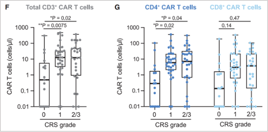 為了驗證CAR-T細(xì)胞 與CRS等級的相關(guān)性,作者分析了76名接受CD19CAR-T治療的DLBCL患者血液中總CD3+CAR-T、CD4+ CAR T和CD8+ CAR T的細(xì)胞絕對數(shù)量。與未發(fā)生CRS的患者相比,發(fā)生1~3級CRS的患者,在回輸后第7天的峰值前后,其外周血中total CD3+ CAR T、CD4+ CAR T和CD8+ CAR T細(xì)胞的絕對數(shù)都更高。但CD4+ CAR -T細(xì)胞的增加更為明顯(圖6)。經(jīng)歷CRS(1級、2級或3級)的患者比沒有經(jīng)歷CRS(0級)的患者血液中CD4+ CAR - T細(xì)胞平均多3.43倍,而CD8+ CAR - T細(xì)胞平均多1.73倍。總之,這些臨床觀察結(jié)果與CD4+ CAR - T細(xì)胞在CRS誘導(dǎo)中起主要作用的觀點一致。