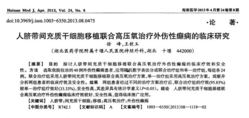 2013年,一項關于人臍帶間充質干細胞移植聯(lián)合高壓氧治療外傷性癲癇的臨床研究數(shù)據(jù)發(fā)表,結果顯示該療法臨床療效較好,安全性高,值得臨床推廣應用。
