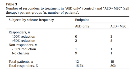 治療后隨訪時間超過1年,細胞治療組在總緩解率上有明顯優(yōu)勢(80%):10名患者中有8人對藥物有反應,其中3人完全緩解(一年及以上無癲癇發(fā)作)。而對照組(16.7%)僅2人有反應。