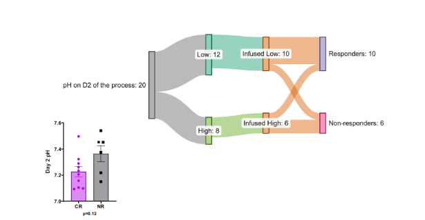 通過分析低pH組和高pH組之間的疾病反應率發現,在D2低pH組的12名患者中,10名患者進行了輸注, 在接受細胞治療的患者中,8例(80%)達到完全緩解(CR),其定義為28天的完全骨髓緩解。高pH組6名患者接受了CAR - T細胞輸注。與低pH組相比,在高pH組中,只有2例(33%)患者達到臨床緩解,4例(67%)患者沒有達到臨床緩解。由此可見達到完全緩解的患者多集中在低PH組CR為80%,而PH組CR僅為33%。因此,在生產開始時,細胞pH值較高的患者往往具有較低的臨床反應概率(圖4)。