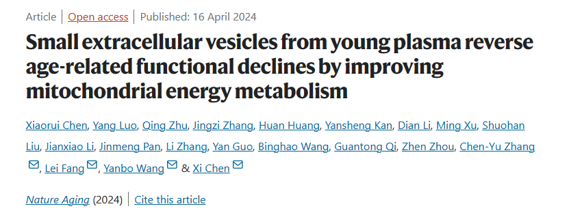 南京大學陳熹、王延博、方雷和張辰宇教授領導的研究小組最近發現,年輕小鼠血液中的一種叫做小細胞外囊泡(SEV)的物質具有潛力延長壽命、恢復機體生理功能,并且能夠逆轉與年齡相關的退行性變化。最新研究題為“年輕血漿中的小細胞外囊泡逆轉與年齡相關的功能下降通過改善線粒體能量代謝”,已在《自然衰老》雜志上發表。